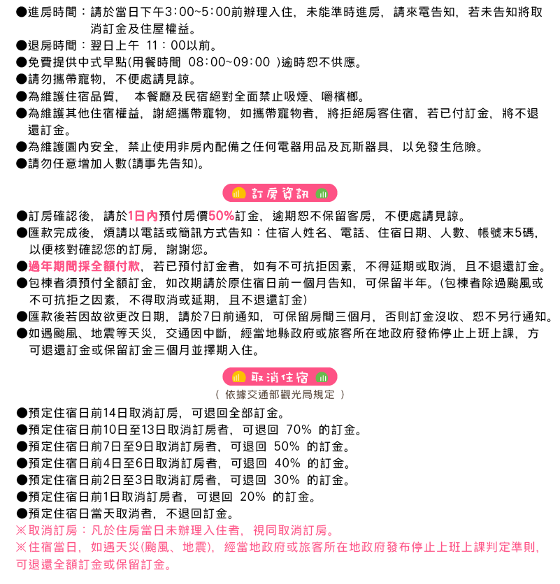 ●匯款後若因故欲更改日期,請於7日前通知,可保留房間三個月,否則訂金沒收、恕不另行通知。