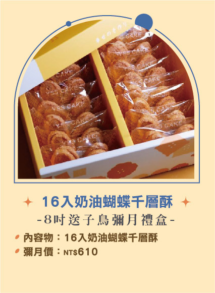 濃濃頂級奶油香氣,採用82%紐西蘭天然無鹽奶油,每一口都是紮實的美味,是彌月媽咪的首選。 訂購滿30條專屬 彌月價 │ NT$270